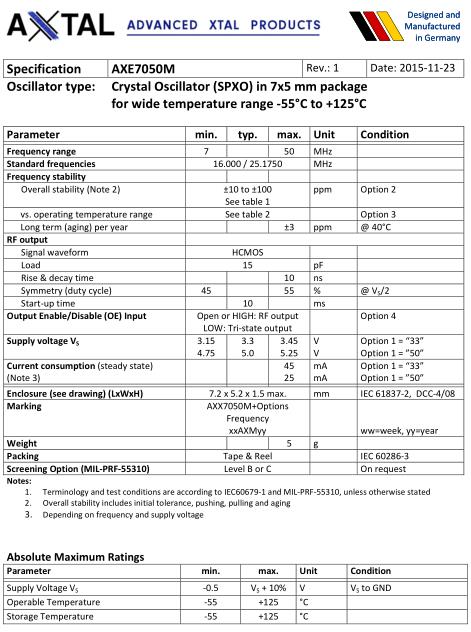 AXTAL晶振是一家比較年輕的頻率元件品牌,2003年成立的AXTAL Crystal公司,擁有比較新型的生產設備和技術,AXTAL德國石英晶振在這十幾年的發展當中,規模日漸壯大,生產大量符合市場的需要的頻率控制元器件,包括石英晶體諧振器,SPXO振蕩器,有源晶振等元件.AXTAL晶振,AXE7050M晶振,AXE7050M-50-25-2C_Rev.1-10.000MHz晶振.