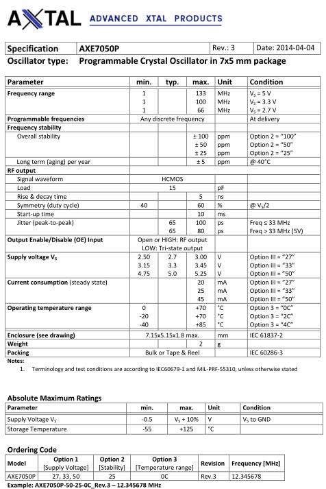 AXTAL晶振,AXE7050P晶振,AXE7050P-50-25-0C_Rev.3-12.000MHz晶振
