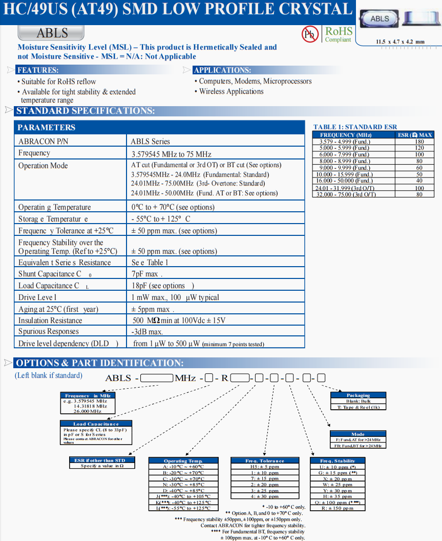 ABLS-13.000MHZ-K4T | Abracon | ABLS | 13 MHz | ±50ppm | ±30ppm | 18 pF |