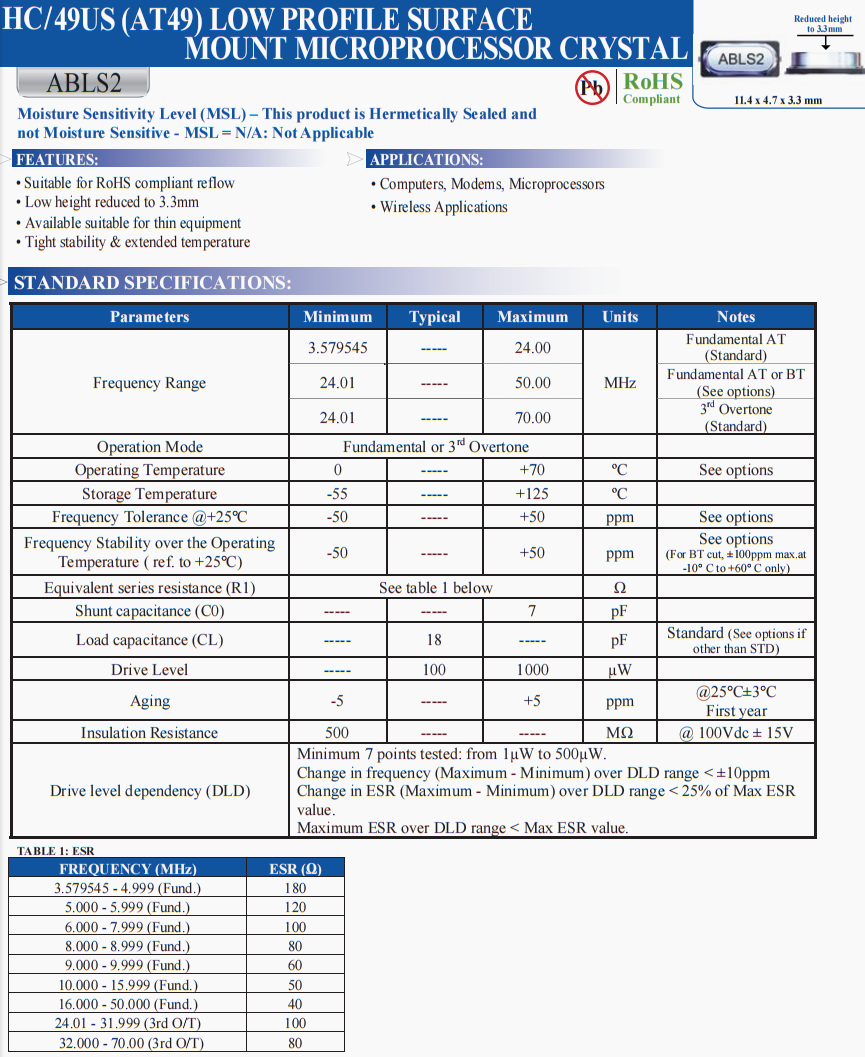 ABRACON美國49SMD晶振,ABLS2-11.0592MHZ-B1U-T汽車收音機晶振,ABLS2環(huán)保晶振
