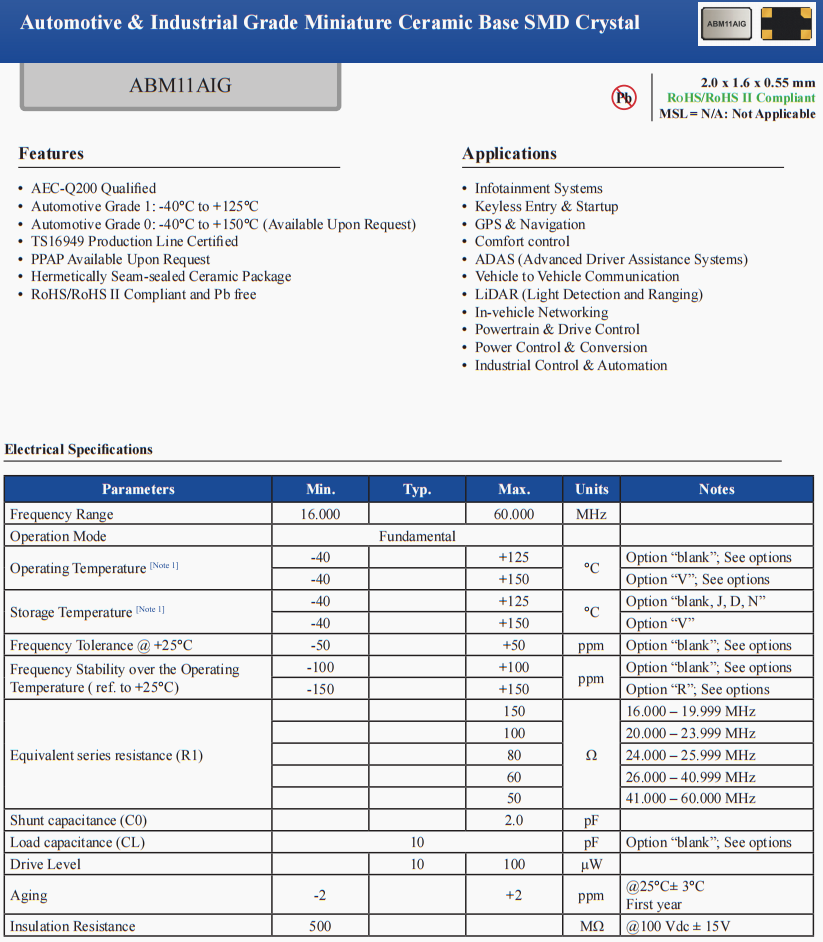 Abracon高精度晶振,ABM11AIG超小型晶振,ABM11AIG-19.200MHZ-J4Z-T3車載香薰系統(tǒng)晶振,美國Abracon晶振公司,艾博康晶振,ABM11AIG晶振,ABM11AIG-19.200MHZ-J4Z-T3晶振,進口晶振,無源晶振,美國晶振,高品質(zhì)晶振,低損耗晶振,高精度晶振,2520晶振,四腳晶振,石英晶體,貼片晶振。適用于RoHS回流配置文件,AEC-Q200合格,汽車等級1:-40°C至+125°C,汽車等級0:-40°C至+150°C(可根據(jù)要求提供),TS16949生產(chǎn)線認證,PPAP可根據(jù)要求提供,密封密封陶瓷封裝,符合RoHS/RoHS II標準且不含鉛,信息娛樂系統(tǒng),無鑰匙進入和啟動,GPS和導(dǎo)航,舒適控制,ADAS(高級駕駛輔助系統(tǒng)),車對車通信,激光雷達(光探測和測距),車載網(wǎng)絡(luò)。