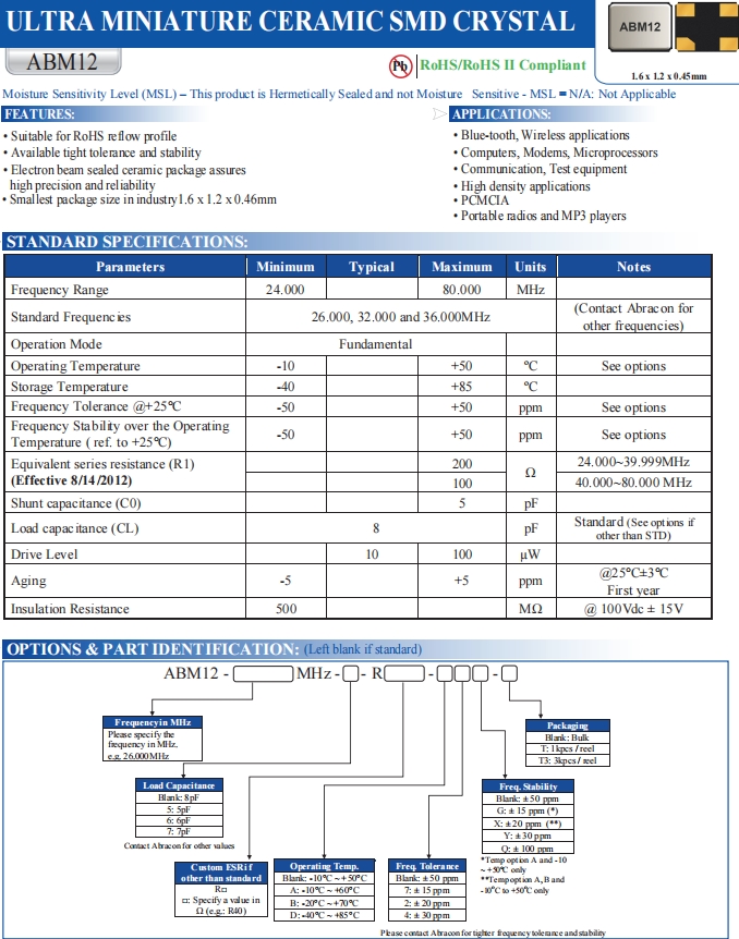 ABM12-116-26.000MHZ-T3 | Abracon晶振 | ABM12 | MHz Crystal | 26MHz |