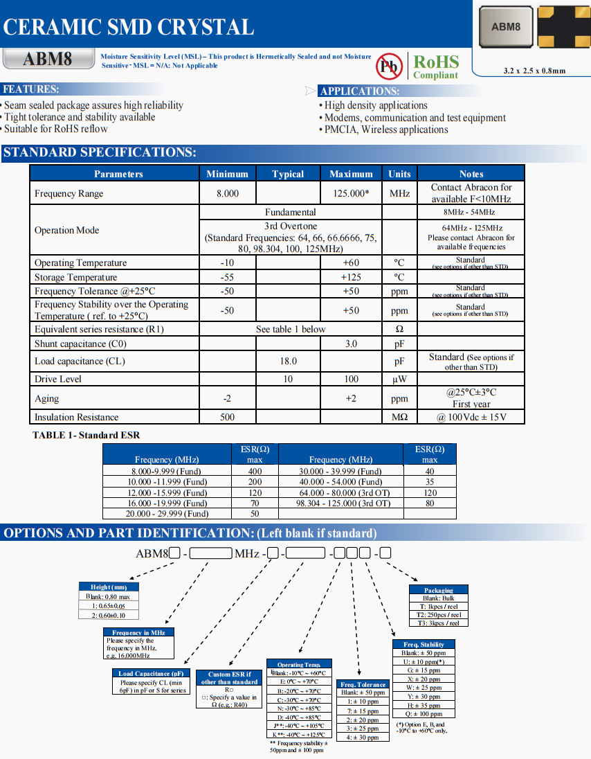 ABM8-18.432MHZ-B2-T3 | Abracon | ABM8 | 18.432 MHz | ±50ppm | ±20ppm | 18 pF |