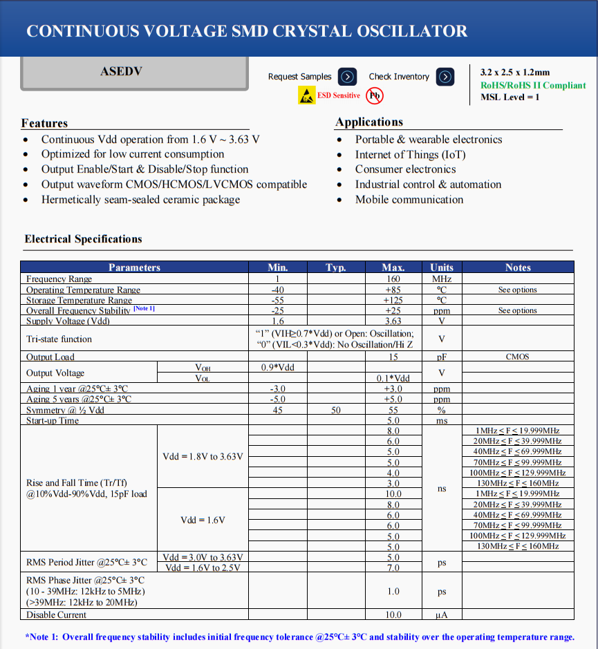 ASEDV-32.000MHZ-LC-T | Abracon晶振 | ASEDV | XO | 32 MHz | 1.6V ~ 3.6V | ±50ppm |