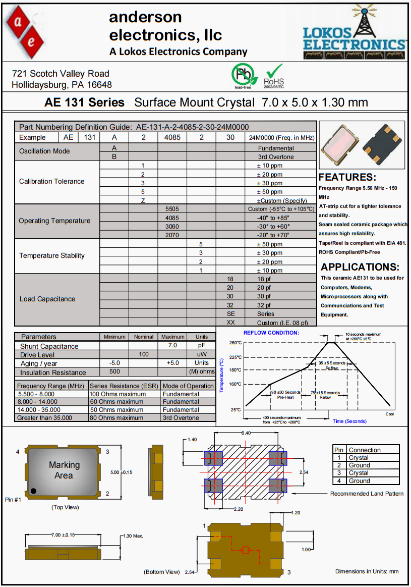 Anderson進口晶體,AE-131-A-2-4085-2-30-20M0000晶振,6G路由器晶振