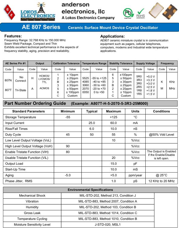 Anderson晶振,AE807晶振,A807T-H520705-3R3-26M000晶振