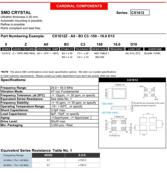Cardinal晶振,CX1612晶振,CX1612Z-A0-B3C3-150-16.0D12晶振