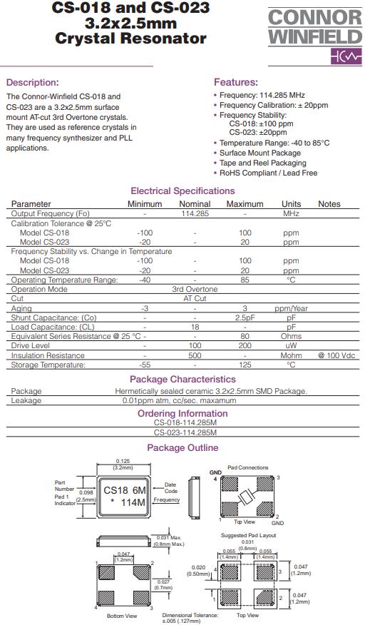 康納溫菲爾德晶振,CS-018晶振,CS-018-114.285M晶振