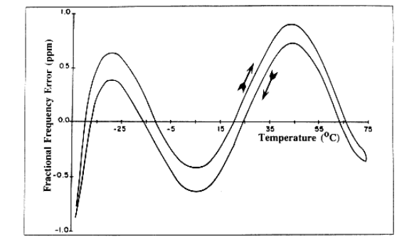Retrace限制了在OCXO開關循環的應用中使用OCXO可實現的精度,當溫度循環范圍為0°C至60°C和-55°C至+85°C時,TCXO中典型的滯后值范圍為1ppm至0.1ppm,在少數SC切割(MCXO)諧振器中觀察到小于1×10-8的滯后,MCXO早期模型中典型的MCXO石英晶體諧振器滯后是108中的幾個部分,典型的OCXO回掃規格,在約25°C的24小時關閉期后,范圍從2x 10-8到1x10-9,在關閉期間的低溫儲存和延長關閉期通常會使回掃更糟,滯后和回掃的原因尚不清楚,迄今為止的實驗證據尚無定論.