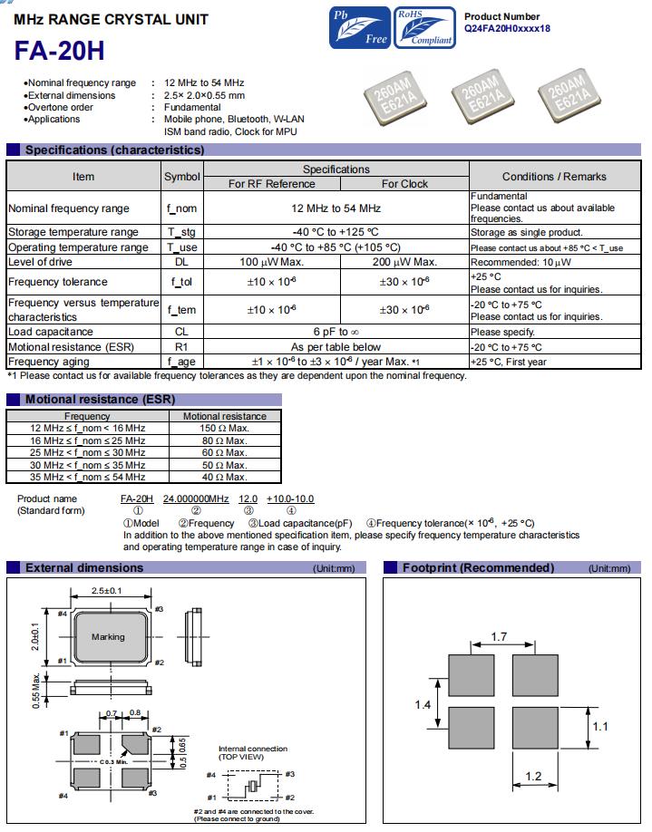 Q24FA20H00054 | 2.5 x 2 x 0.55mm | FA-20H | 24.000000 MHz | 12 pF | +/-30 ppm | -20 to +75 °C |