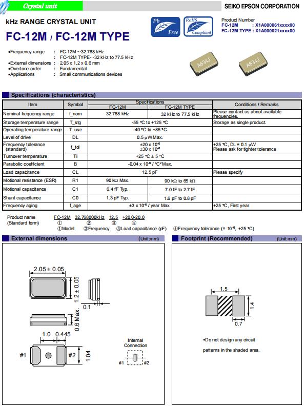 X1A000061000600 | 2.05 x 1.2 x 0.6 mm | FC-12M | 32.768kHz | 7 pF | +/-20.0 ppm | -40 to +85 °C |