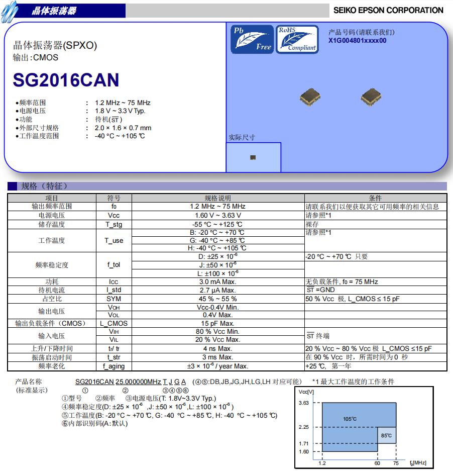 X1G0048010035 | 愛普生振蕩器 | SG2016CAN | 25.000000 MHz | 2.00 x 1.60 x 0.70 mm | CMOS | 1.600 to 3.630 V | -40 to 105 °C | +/-50 ppm |