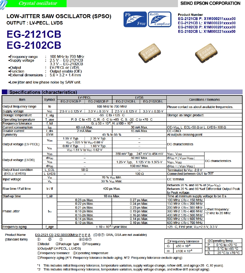 X1M0002110002 | 愛普生晶振 | EG-2121CB | 212.500000 MHz | 5.00 x 3.20 x 1.40 mm | LV-PECL | 2.375 to 2.625 V | -20 to 70 °C |