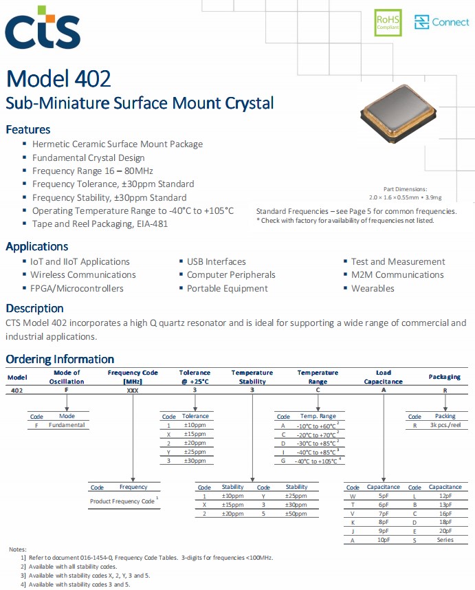 美國進口CTS西迪斯晶振Model 402系列,是一款小體積晶振尺寸2.0x1.6mm超微型表面貼裝石英晶體,四腳貼片晶振,無源晶振,石英晶振,石英晶體諧振器,無鉛環(huán)保晶振,頻率范圍:16MHz至80MHz,工作溫度范圍:-40℃至+105℃,具有超小型,輕薄型,耐熱、耐振、耐沖擊等優(yōu)良的耐環(huán)境特性,滿足無鉛焊接的高溫回流溫度曲線要求,符合AEC-Q200標(biāo)準(zhǔn)。貼片晶振應(yīng)用:物聯(lián)網(wǎng)和IIoT應(yīng)用,無線通信,F(xiàn)PGA/微控制器,USB接口,計算機外圍設(shè)備,便攜式設(shè)備,測試和測量,M2M通信,可穿戴設(shè)備等應(yīng)用。超小型表面貼裝晶體402F240XXCJR非常適用于便捷式設(shè)備應(yīng)用