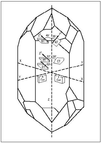 晶片的切割可分為AT-CUT, BT-CUT, CT-CUT, DT-CUT, FT-CUT, XT-CUT, YT-CUT,如圖所示.它是以光軸(Z軸)為參考而命名,每種切法對應(yīng)一個角度.采用何種切法應(yīng)根據(jù)實際情況而定,如對溫度特性要求較好則應(yīng)采用AT-CUT,如果對晶振要求的頻率較高時則采用BT-CUT.晶片的切割方式、幾何形狀、尺寸等決定了貼片晶振的頻率.(你知道嗎?)