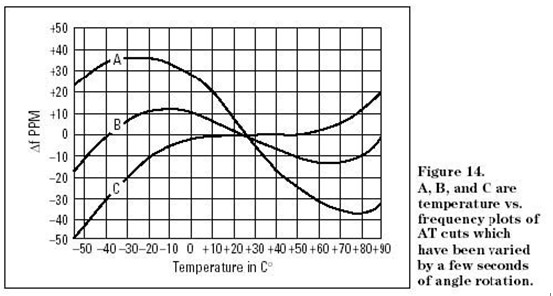 左邊以AT-CUT和BT-CUT為例,比較不同的切割方法對晶振參數(shù)的影響: AT-Cut: 切割角度:35013’(一般誤差在±3’,其誤差越小其溫度特性越好,) F(K)=1670(K)/t(mm) t為晶片之厚度,一般運用,溫度特性較發(fā)好,+/-30PPM BT-Cut: 切割角度:490 F(K)=2560(K)/t(mm) t為晶片之厚度, AT-Cut用于基頻高頻,溫度特性差, +/-100PPM 當AT-CUT與BT-CUT頻率一樣時,AT-CUT的本體要比BT-CUT的本體小,其C0,C1,L1也不一樣,如頻率為35MHZ,當其面積一樣時,AT-CUT本體的厚度為0.02mm,而BT-CUT的本體厚度為0.073mm. AT-CUT的C0為5.5pf,而BT-CUT的C0為2.7pf. AT-CUT溫度曲線如圖所示,現(xiàn)在我們所用的晶振的中心溫度值一般多為25±3oC,在-10 oC~70 oC這一區(qū)間,其溫度頻差一般為±30PPM,溫度特性較好.