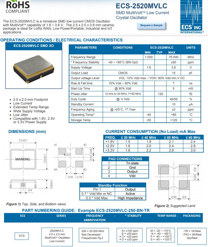 ECS-2520MVLC是一款微型SMD低電流CMOS石英晶體振蕩器,低電流振蕩器在-40°C至+85°C范圍內(nèi)的穩(wěn)定度為50 ppm。ECS-2520MVLC采用2.5毫米x 2.0毫米x 0.8毫米陶瓷封裝,具有多電壓功能,并且兼容1.8V、2.5V、3.0V或3.3V電源,輸出頻率范圍很寬,從1MHz到75MHz。這款器件是一款緊湊型、高性能、低電流、低成本晶振,非常適合消費(fèi)電子、工業(yè)和通信領(lǐng)域的低功耗/便攜式,工業(yè)和物聯(lián)網(wǎng)應(yīng)用。