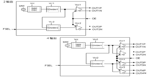 此款產品與原先SAW振蕩器完全不同,因為內建了扇出緩沖※3,從而實現了2個或4個時鐘同時輸出※4的一體化封裝.在內建扇出緩沖的基礎上實現了低抖動特性.因此,大大減少了需要多個時鐘源的用戶處理系統的產品部件數量,低耗電節省了安裝面積為電子行業做出了巨大貢獻.