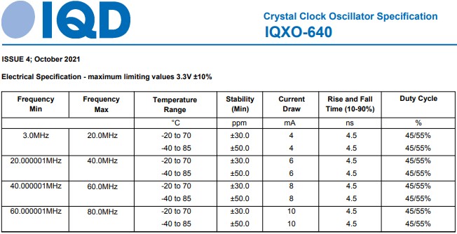 頻率參數(shù):頻率3.0MHz至80.0MHz,頻率穩(wěn)定性:30.00ppm至100.00ppm,25°C時(shí)最大老化率為5ppm年