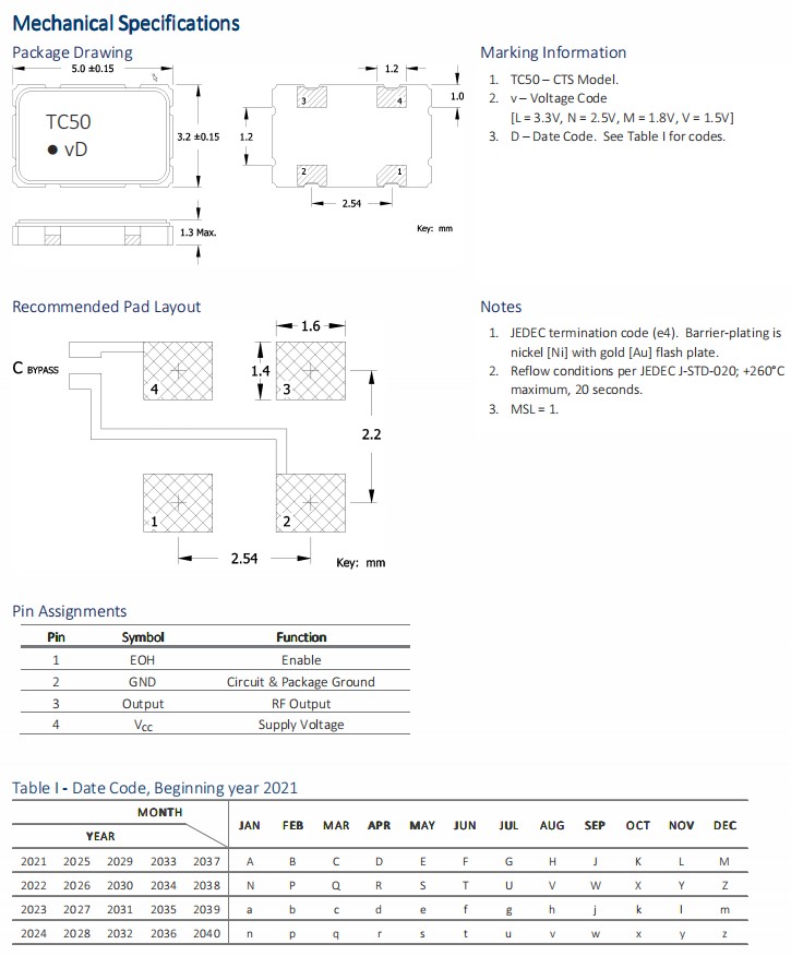 TC50晶振特點(diǎn):尺寸5.0x3.2x1.3mm貼片晶振,低功耗,最大值為200µA,陶瓷表面安裝封裝,基本水晶設(shè)計(jì),+1.8V,+2.5V或+3.3V工作電壓,工作溫度范圍:-40°C到+85°C,