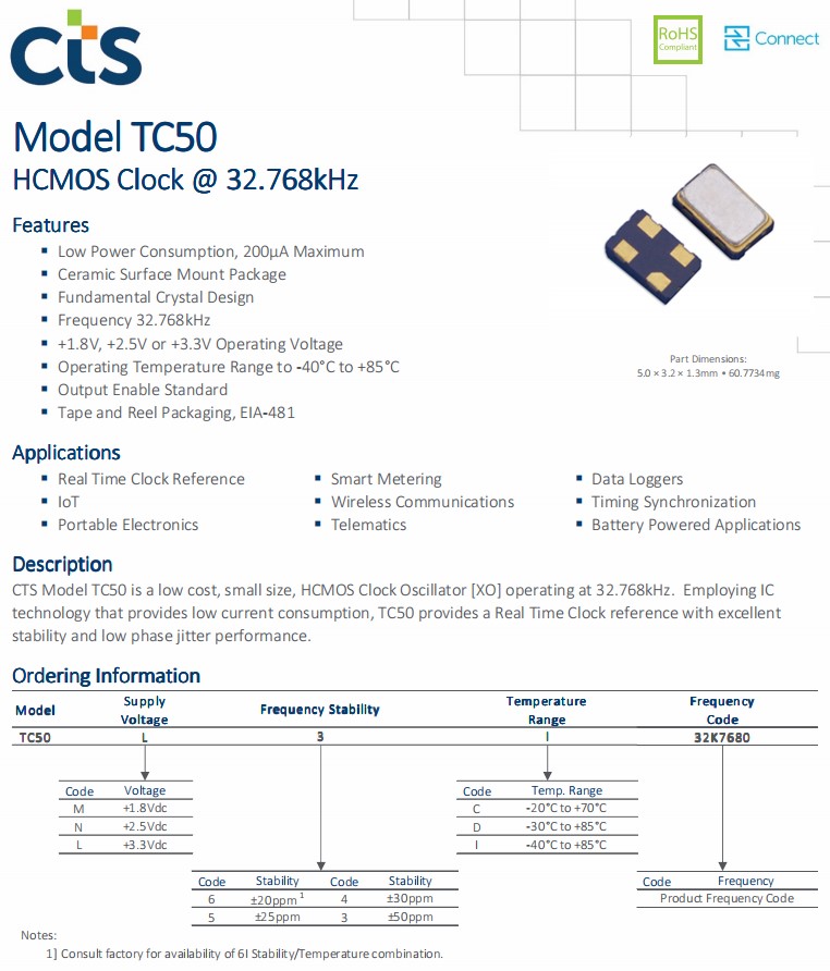 TC50L3C32K7680 | CTS晶振 | TC50 | 32.768kHz | ±50ppm | 4-SMD, No Lead |