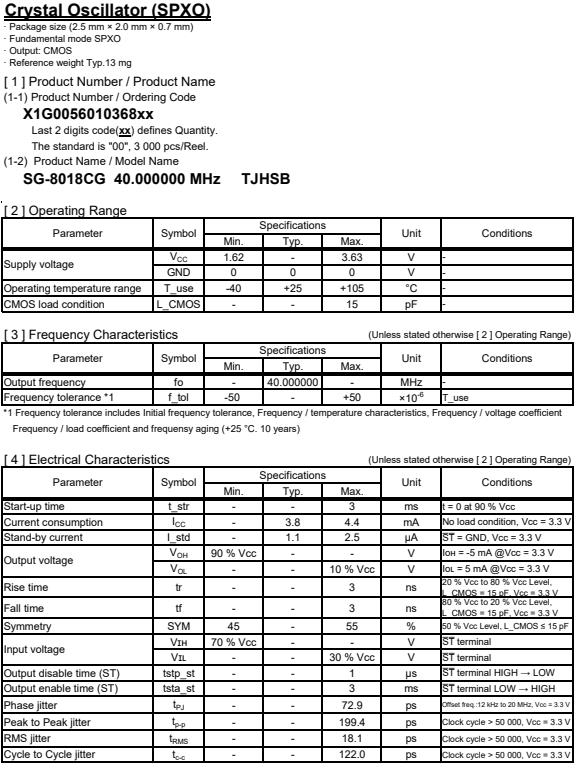 X1G005601036400 | SG-8018CG | 24.519000 MHz | 2.50 x 2.00 x 0.80 mm | CMOS | 1.620 to 3.630 V | -40 to 105 °C | +/-50 ppm | ≤ 4.4 mA |