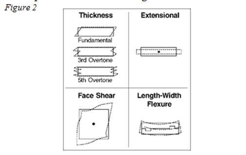 如上所示的進口晶振元件以各種模式振動,其中最重要的是拉伸、彎曲和剪切.振動模式決定了給定元件的最大頻率、穩定性與溫度的關系以及電阻.各種振動模式如圖2所示,而各種頻率穩定性與溫度的比較如圖3所示.