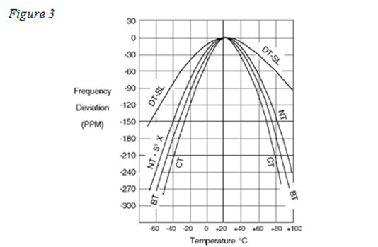 在各種元件中,石英晶振“AT”切割變得最受歡迎,因為它在相對較高的頻率下可用,表現出出色的頻率與溫度穩定性,并且以合理的成本廣泛可用.“AT”切割晶體單元的頻率與溫度能力如圖4所示.