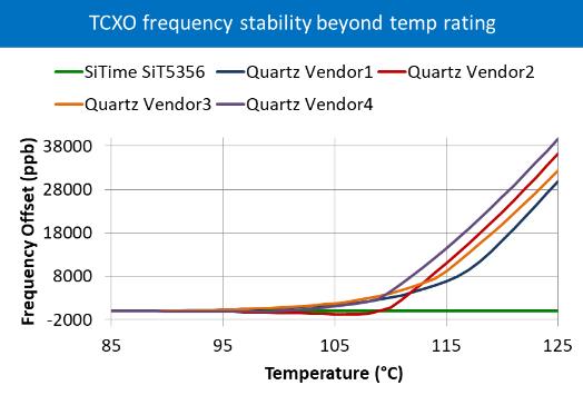 為此,我們推動了各種有源晶振的極限,測量超出額定工作范圍的穩(wěn)定性.我們測試了額定溫度為+85°C的TCXO器件并將其推至+125°C,并測試了額定溫度為+85°C,最高溫度為+105°C的OCXO.以下圖表顯示了在這些較高溫度下性能下降的結(jié)果.在每次測試中,我們將MEMS振蕩器(用綠線表示)與來自不同供應(yīng)商的石英振蕩器進行比較,所有這些都在同一類別中且具有相同的溫度額定值.為了使比較更容易,每個器件的值在+85°C時從它們的頻率開始,從同一點開始. 上圖顯示了五個工業(yè)級TCXO器件在+85°C至+125°C的頻率穩(wěn)定性