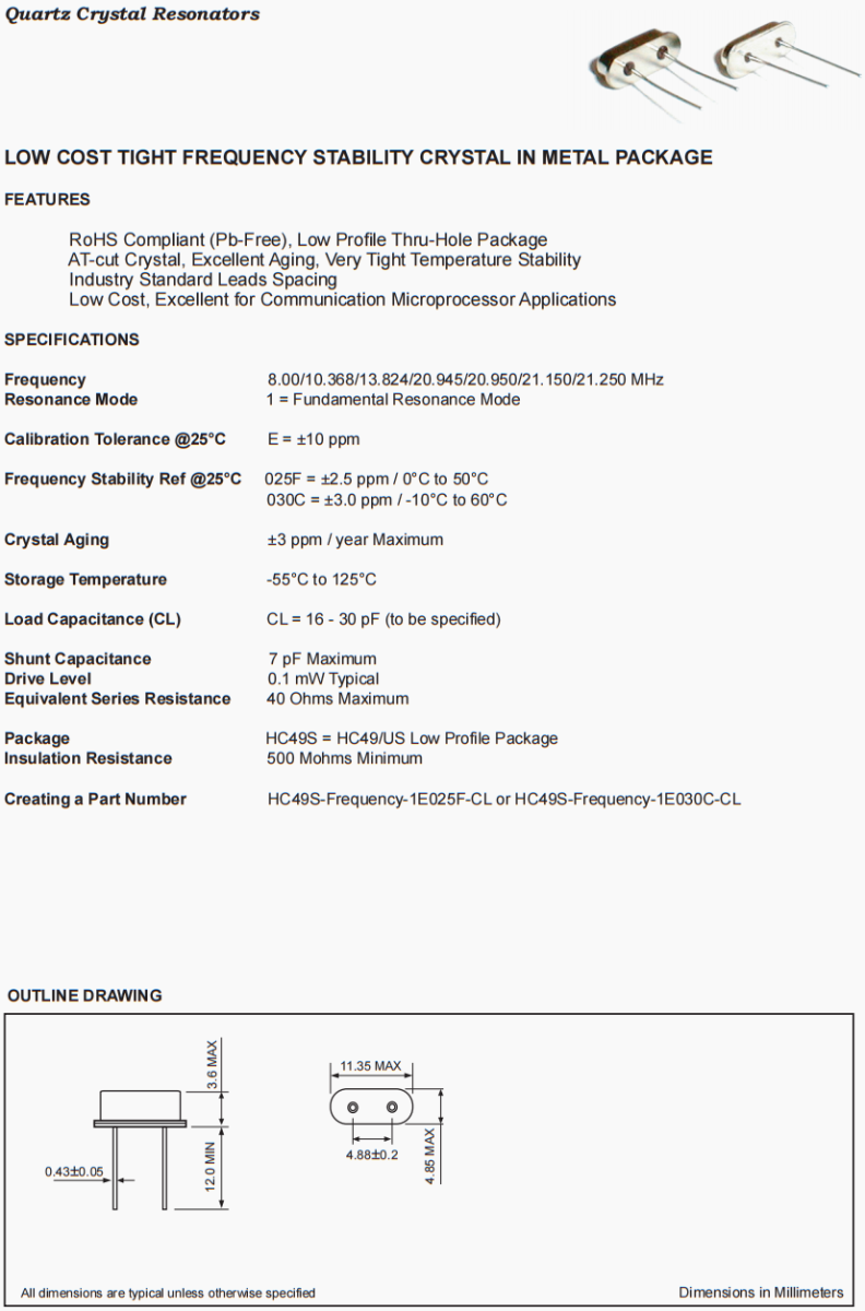 Fortiming49S晶振,HC49S-20M945-1E025F-CL插件晶振,電車充電樁晶振,美國(guó)富通晶振公司,49S插件晶振,歐美進(jìn)口晶振,二腳晶振,F(xiàn)ortiming晶振,低成本晶振,環(huán)保無(wú)鉛晶振,高穩(wěn)定性晶振,石英晶振,6G網(wǎng)絡(luò)終端晶振,無(wú)源晶振,低成本緊密頻率穩(wěn)定晶體金屬封裝,特點(diǎn),符合RoHS標(biāo)準(zhǔn)(無(wú)鉛),低外形通孔封裝,at切割晶體,優(yōu)異的老化,非常緊密的溫度穩(wěn)定性,行業(yè)標(biāo)準(zhǔn)引線間距,低成本,卓越的通信微處理器應(yīng)用。
