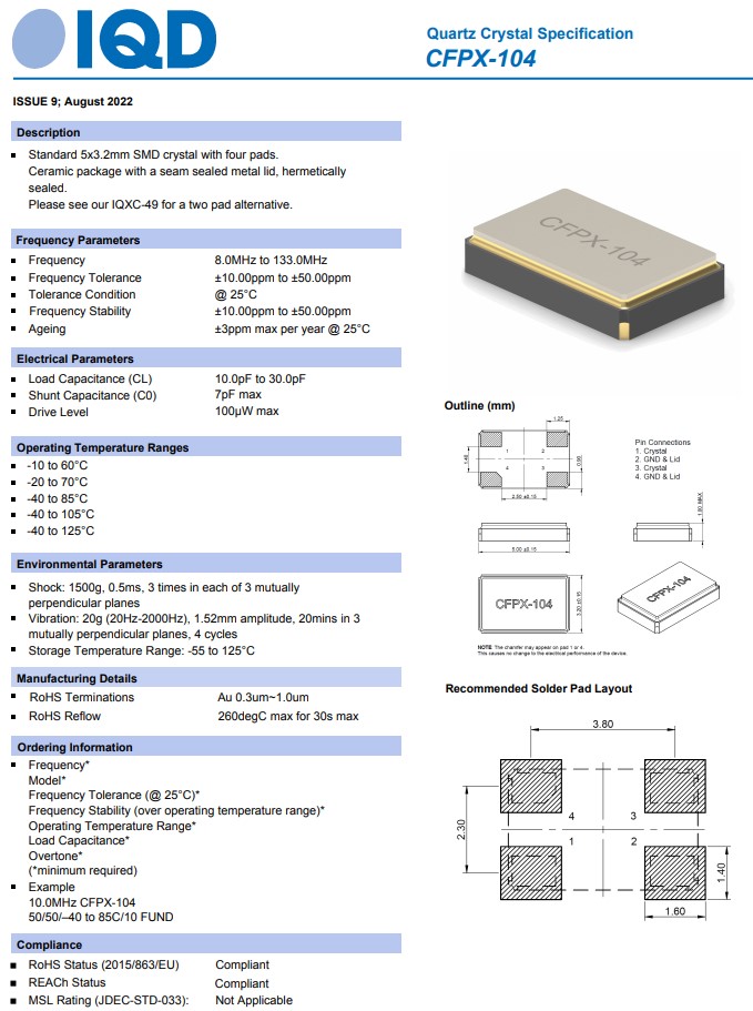 LFXTAL033328BULK | IQD晶振 | CRYSTAL 14.7456MHZ 18PF SMD | CFPX-104 |