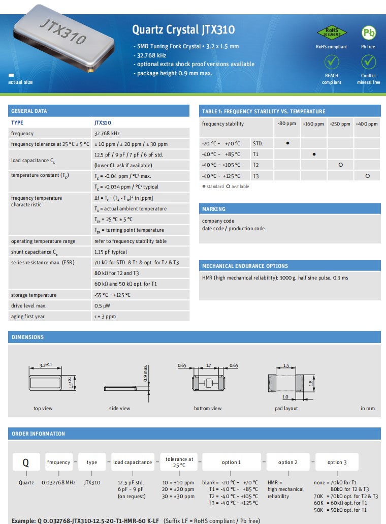 Q 0.032768-JTX310-12.5-10-T1-HMR-50K-LF | Jauch晶振 | JTX310 | 32.768kHz |