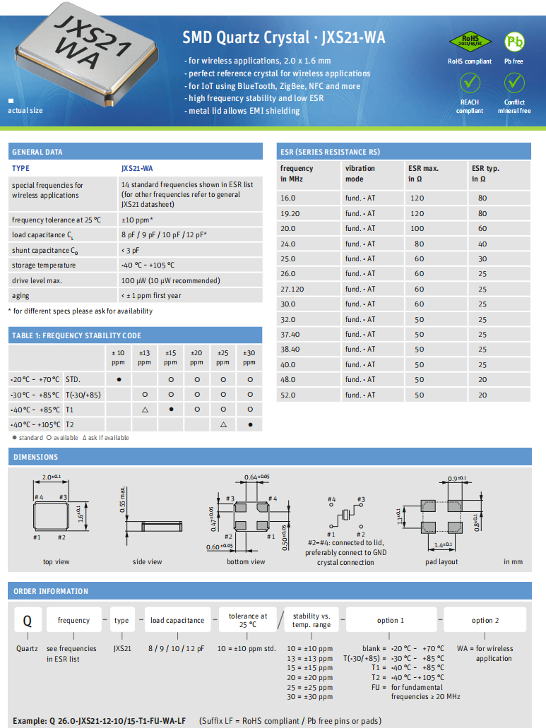 Jauch晶振,法國(guó)進(jìn)口晶振,型號(hào):JXS21-WA,編碼為:Q 38.4-JXS21-10-10/10-FU-WA-LF,頻率:38.400MHz,頻率容差:±10ppm,頻率穩(wěn)定性:±10ppm,負(fù)載電容:10pF,工作溫度范圍:-20℃至+70℃,小體積晶振尺寸:2.0x1.6x0.55mm封裝,四腳貼片晶振,石英晶體諧振器,石英晶振,無(wú)源晶振,SMD晶振,2016晶振,石英水晶諧振器。具有超小型,輕薄型,高品質(zhì),高性能,高穩(wěn)定性等特點(diǎn)。應(yīng)用于:無(wú)線應(yīng)用,藍(lán)牙模塊晶振,可穿戴設(shè)備晶振,ZigBee、NFC等的物聯(lián)網(wǎng)應(yīng)用。
