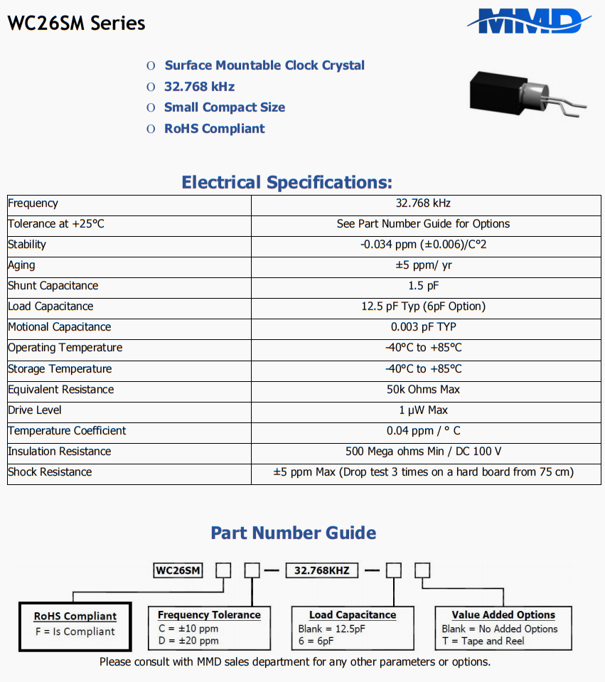WC26SMFC-32.768KHZ-T | MMD | WC26SM | 32.768 kHz | ±10ppm | 12.5 pF | |
