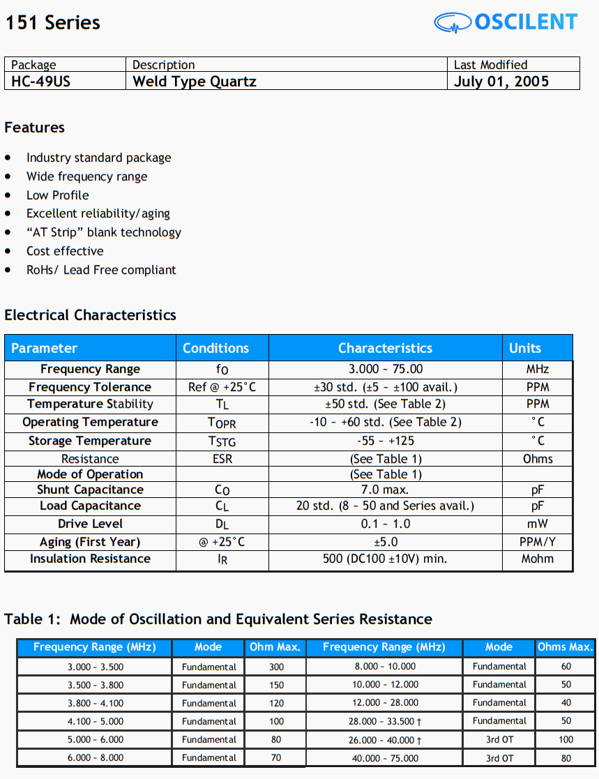 151-3.6864M-10-W-TR晶振,Oscilent美國晶振,醫(yī)療設(shè)備晶振