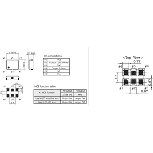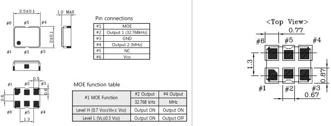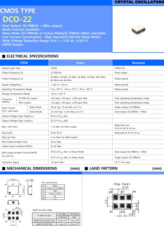 Active Mode | 2.5 mA Typ., 5 mA Max. at 3.3 V | Dual output (32.768kHz + MHz) | |