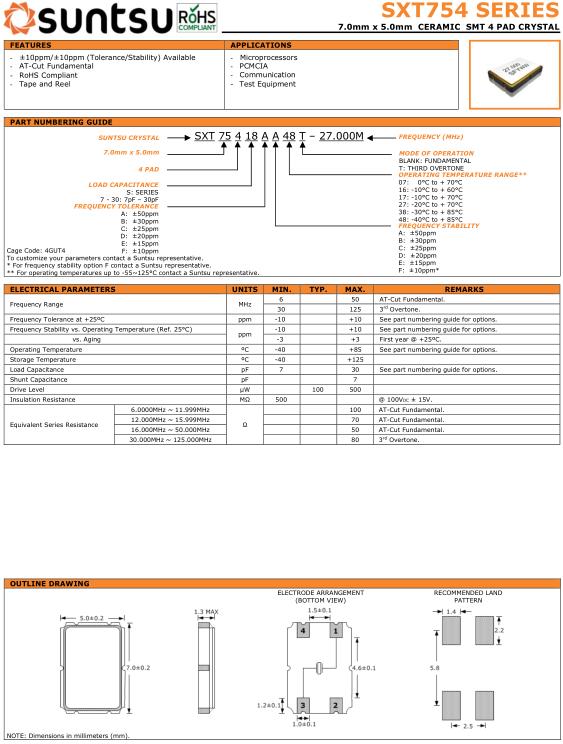 Suntsu晶振規格 | 單位 | SXT754晶振頻率范圍 | 石英晶振基本條件 | |
