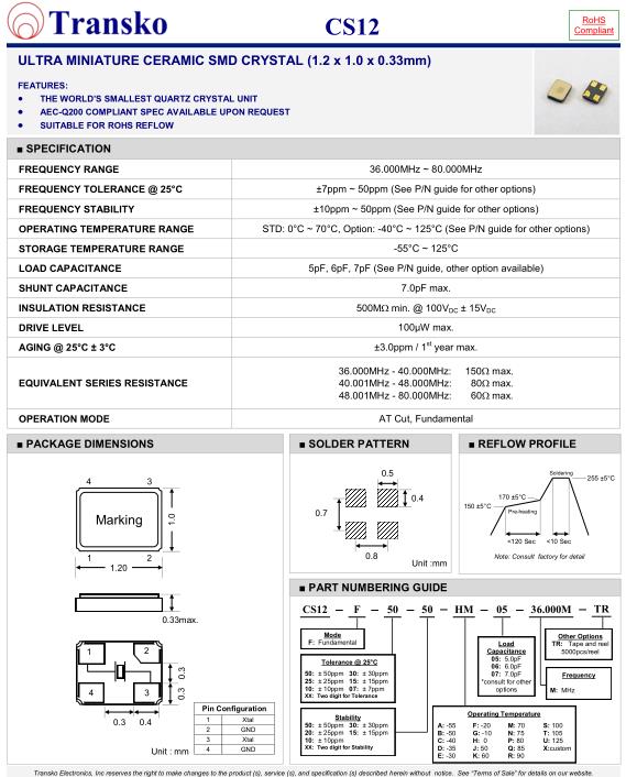 SPECIFICATION-Transko晶振 | CS12晶振 |