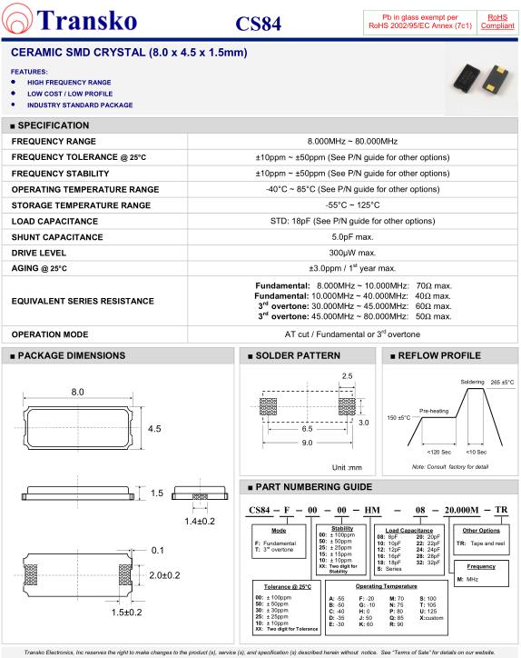 SPECIFICATION-Transko晶振 | CS84晶振 |