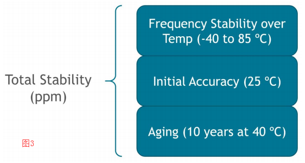 頻率穩定性衡量有源晶體振蕩器的輸出頻率由于溫度變化,在運行期間可能發生變化,如果頻率漂移超出應用程序的預期,可能會出現定時誤差發生,頻率穩定性以百萬分率或ppm表示,相對于特定溫度范圍內的標稱頻率,完整的測量潛在的頻率偏差稱為總穩定性,它是總和頻率穩定性隨溫度變化,初始精度在25°C,老化超過a指定的時間和溫度,如圖3所示,總穩定性揭示了振蕩器可能產生的最壞情況可能的頻率使用壽命.