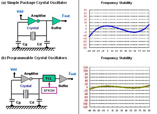 為了滿足應用面需求而言, 石英晶體振蕩器內部的振蕩線路有以基本波或三倍頻不同方式. 若要達到數佰兆赫的輸出頻率時, 振蕩線路后級可以采用鎖相回路方式或倍頻方式, 將較低頻率的石英振蕩頻率提升. 對于輸出端的輸出準位及輸出波形也有各類不同需求,如 CMOS, LVPECL, LVDS…..等. 這些規格都要仔細的定義.