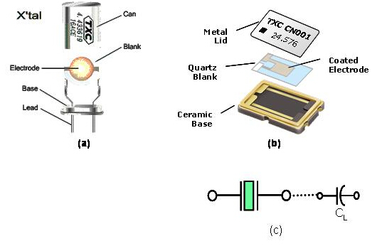 (圖一)(a)及(b)分別是DIP型式及SMD型式的石英振蕩子的基本結(jié)構(gòu)圖. (圖七)(c)是電子電路上所使用代表石英振蕩子的電子符號. 當(dāng)石英晶體共振子處在遠離振蕩頻率區(qū)域時, 石英晶體共振子僅是一個電容性的組件, 當(dāng)頻率接近石英晶體的振蕩頻率時, 就接近是一個電感性的等效LCR振蕩線路.