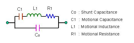(圖二) 就是將石英晶體共振子轉(zhuǎn)換成振蕩頻率附近的Butterworth-Van Dyke (BVD)等效電路. 在這個圖中, 有四個主要參數(shù) : 靜態(tài)電容-Co, 動態(tài)電容-C1, 動態(tài)電感-L1及動態(tài)電阻-R1.