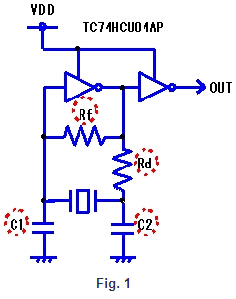 在振蕩電路的設計,它認識到各個組件的作用是必要的.表1中描述的角色了,作為一個例子,一個振蕩電路(圖1)使用一個通用的C-MOS IC(74年由東芝hcuo4ap).Table-1When反饋電阻(Rf)不是安裝在振蕩電路,如表1所示,諧振器不開始振蕩即使電源應用于振蕩電路.除非適當的值連接的電阻器,振蕩不開始正式晶體諧振器的模式,但泛音振動或基本振蕩開始.在基本諧振器(MHz頻帶)反饋電阻通常是1 MΩ.的泛音諧振器(MHz頻帶)值取決于集成電路和頻率特性,但是在幾個kΩ——數萬kΩ的范圍.的音叉型諧振器(千赫樂隊),需要連接一個電阻10 MΩ或更多.