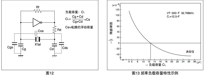 石英晶振的負載容量 (CL) 是用來決定在振蕩電路中晶振頻率的參數,從加在振蕩電路中晶振兩端的電容可知負載容量(參閱圖12). 精工晶振,石英晶振,VT-120-F晶振,精工32.768k音叉表晶因振蕩電路的負載容量的不同,晶振的頻率會相應地產生變動.為了獲得目標的頻率精度,必須使晶振與負載容量相匹 配.在使用時,請根據相應晶振的負載容量,將振蕩電路的負載容量設定為與其相符.