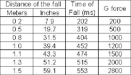 下圖表顯示了將物體放在硬木或乙烯基地板上時達到的G力.在水泥地面上的力要高得多.
